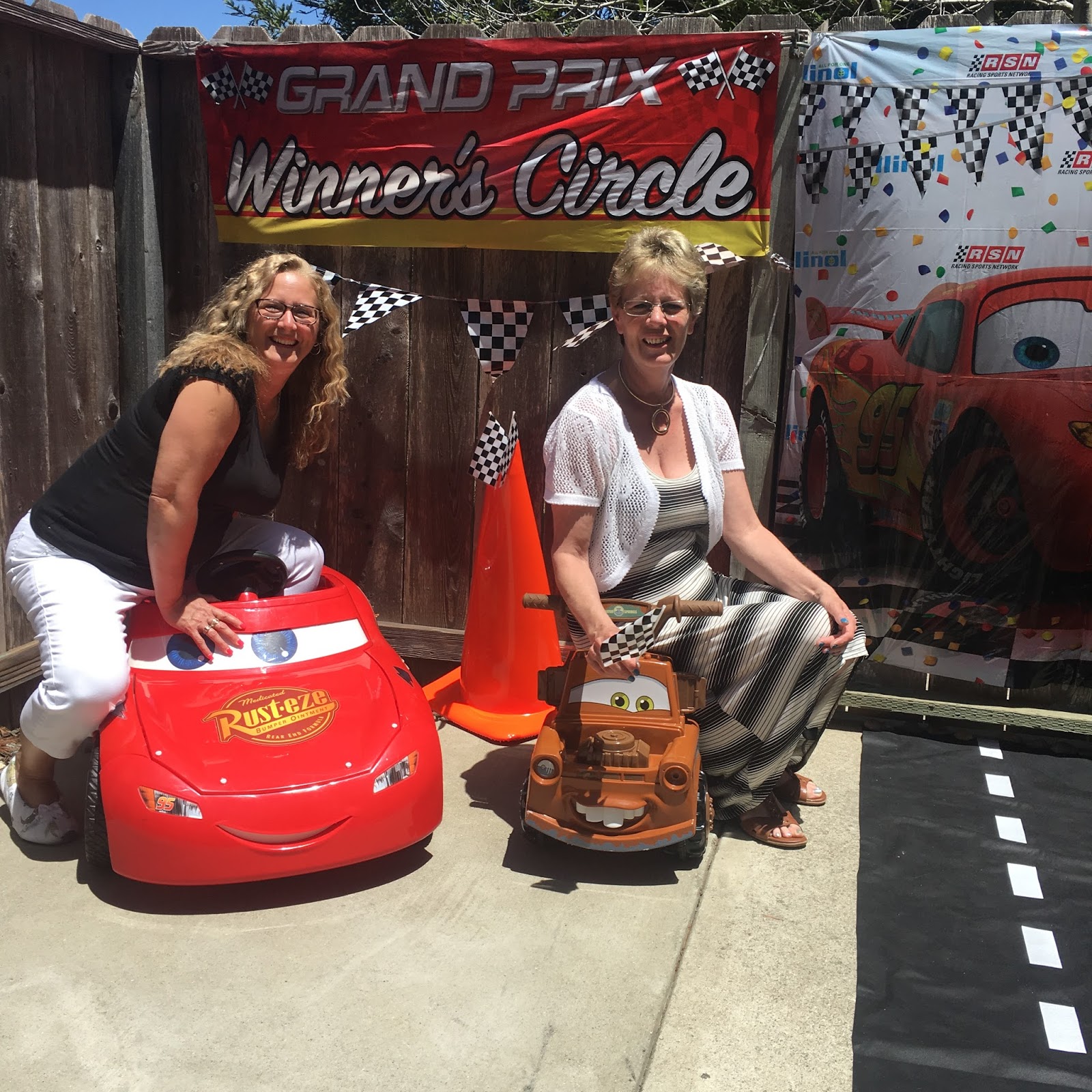 Being a wardrobe stylist by day and a frustrated costumer by night wardrobe is always my first consideration when I select a them for a party. My kids birthday parties are certainly no exception. All of the grown up guests (close friends and family) were asked to wear black and white. As the announcer of the race track I converted a child's prop headset into a wearable one for an adult, paired it with pearls, a red lip and a vintage inspired black and white checkered flag dress! I even used a Lightening McQueen decal and created a belt for my look!